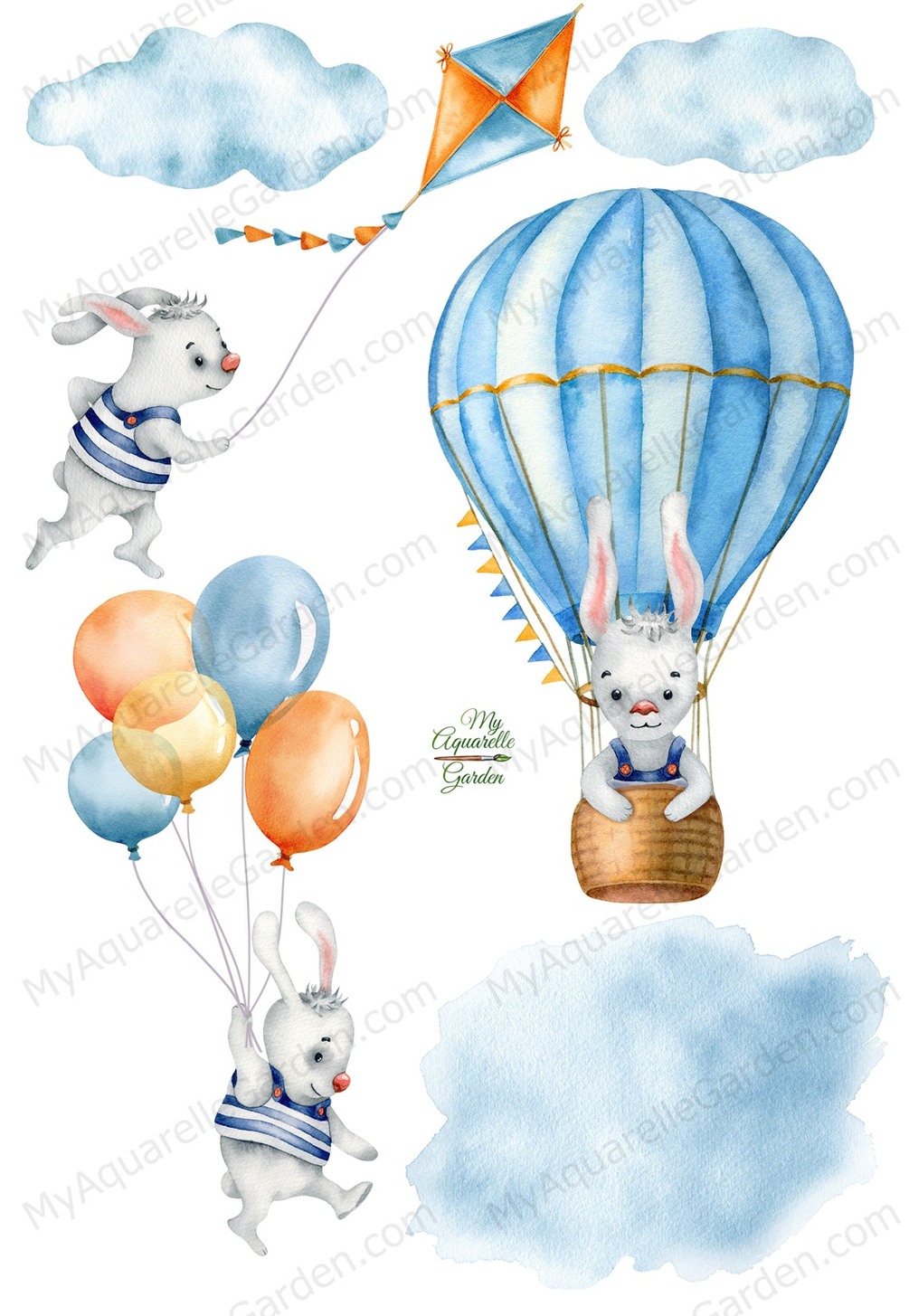Air adventure. Cute bunny. Hot air balloon, kite, clouds.