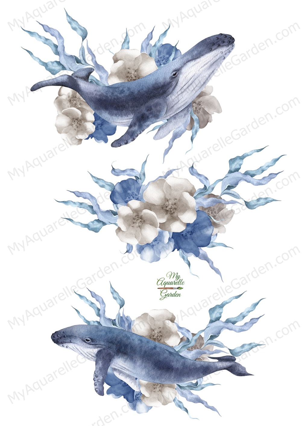 Blue whales with sea grass and flowers compositions.